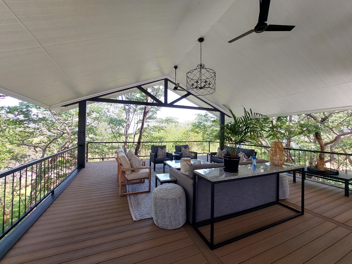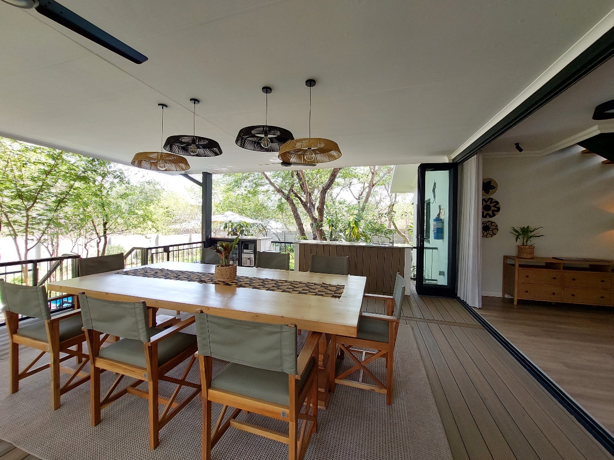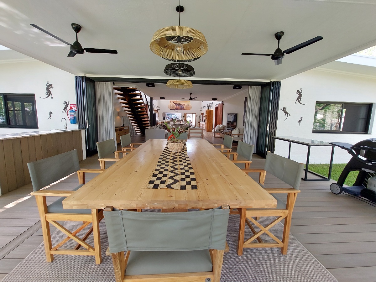 The Luxury Villa has been built in an open-plan layout encompassing the kitchen, dining area, and main lounge, (complete with a flat-screen TV). There are 4 en-suite bedroom suites that lead off either to the right or left of this main area. Located at the opposite end of the villa from the entry point is an outdoor entertainment area, which is accessed from the lounge through floor to ceiling stacking doors. This outdoor space features a 12-seater dining table, a gas BBQ, a drinks fridge with an ice machine and handy prep area. The sun deck includes a swimming pool and loungers, all overlooking the beautifully landscaped gardens