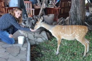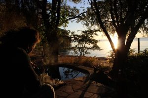 The next morning coffee was delivered bright and early to our room. What a beautiful way to greet the new day, – coffee on a cold morning watching the sun rise over Lake Kariba. We had been in a bit of a rush the previous evening with our late arrival, so had not had time to really appreciate the beautiful setting of the rooms. They are situated right on a beach on the shores of the lake, and the 2 honeymoon suites have their very own private plunge pools! To get to the rooms, you walk on paths through the bush, right past a bird hide, with bushbuck grazing, there is a resident semi-tame female bushbuck who you are able to feed by hand under the watchful eye of Steve.