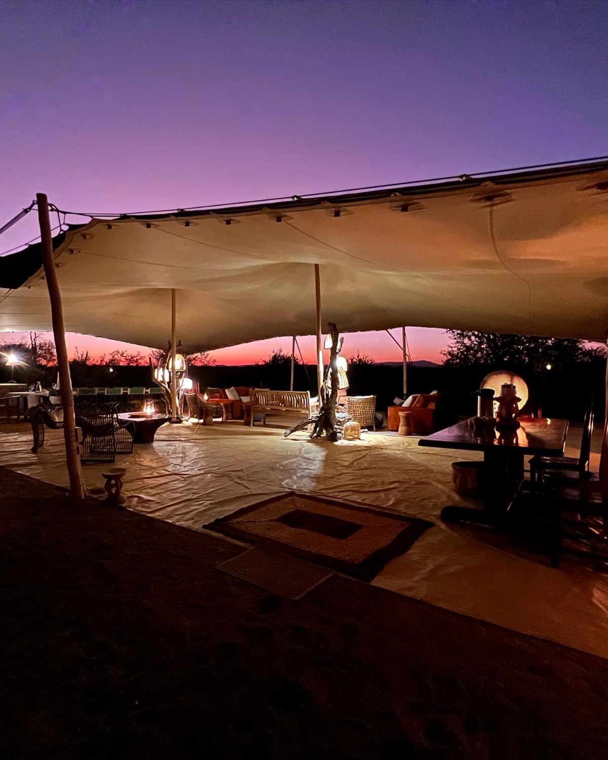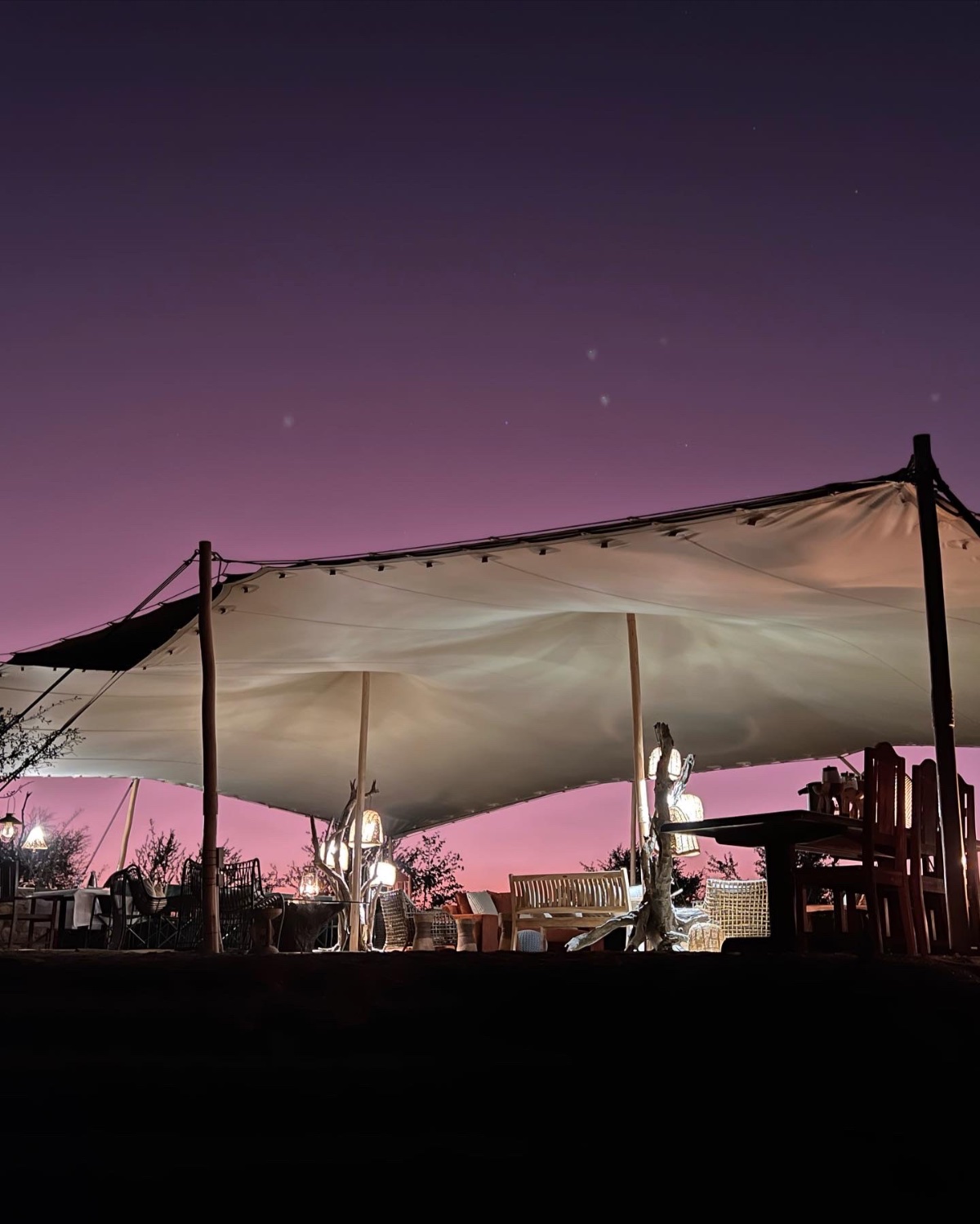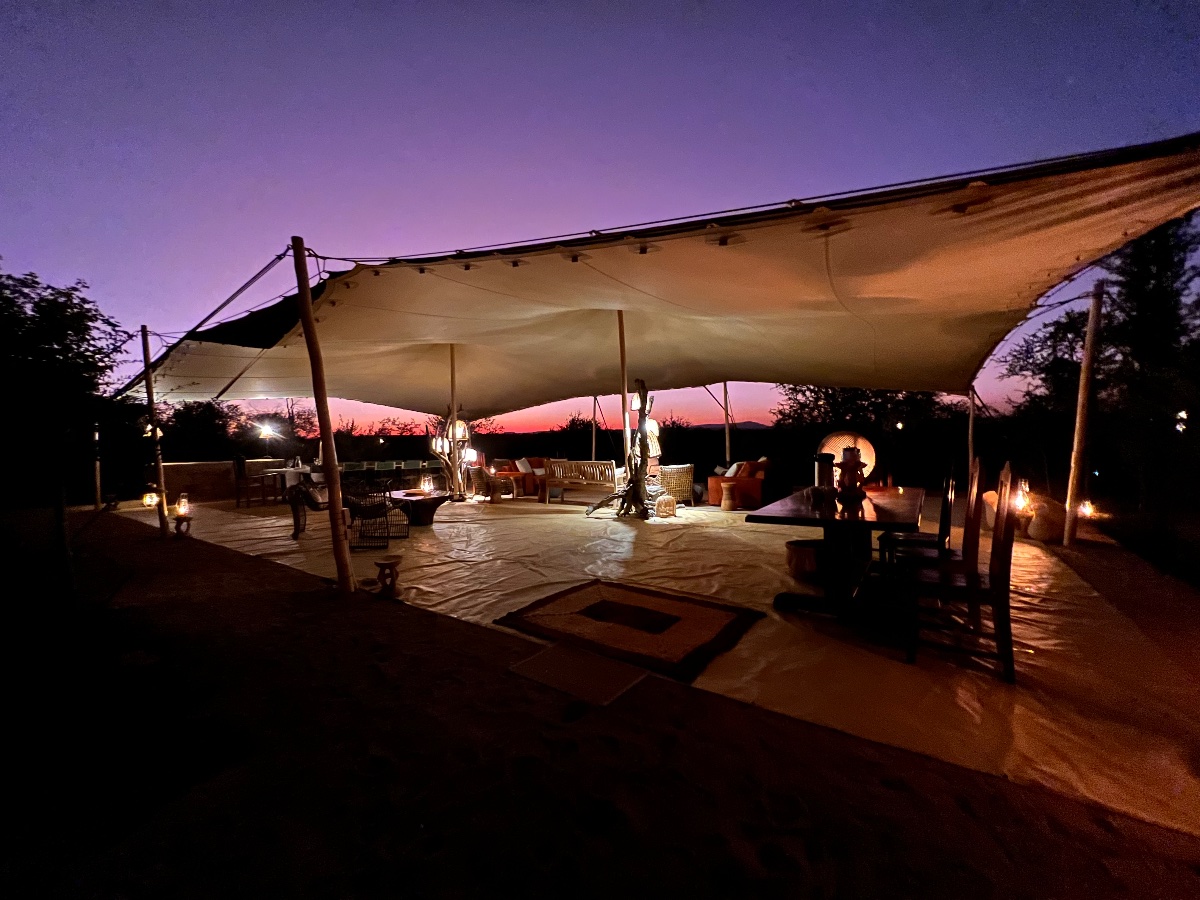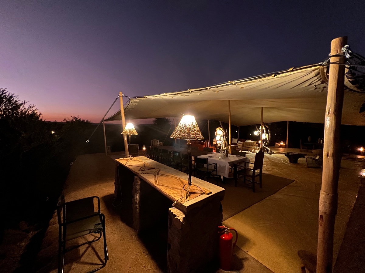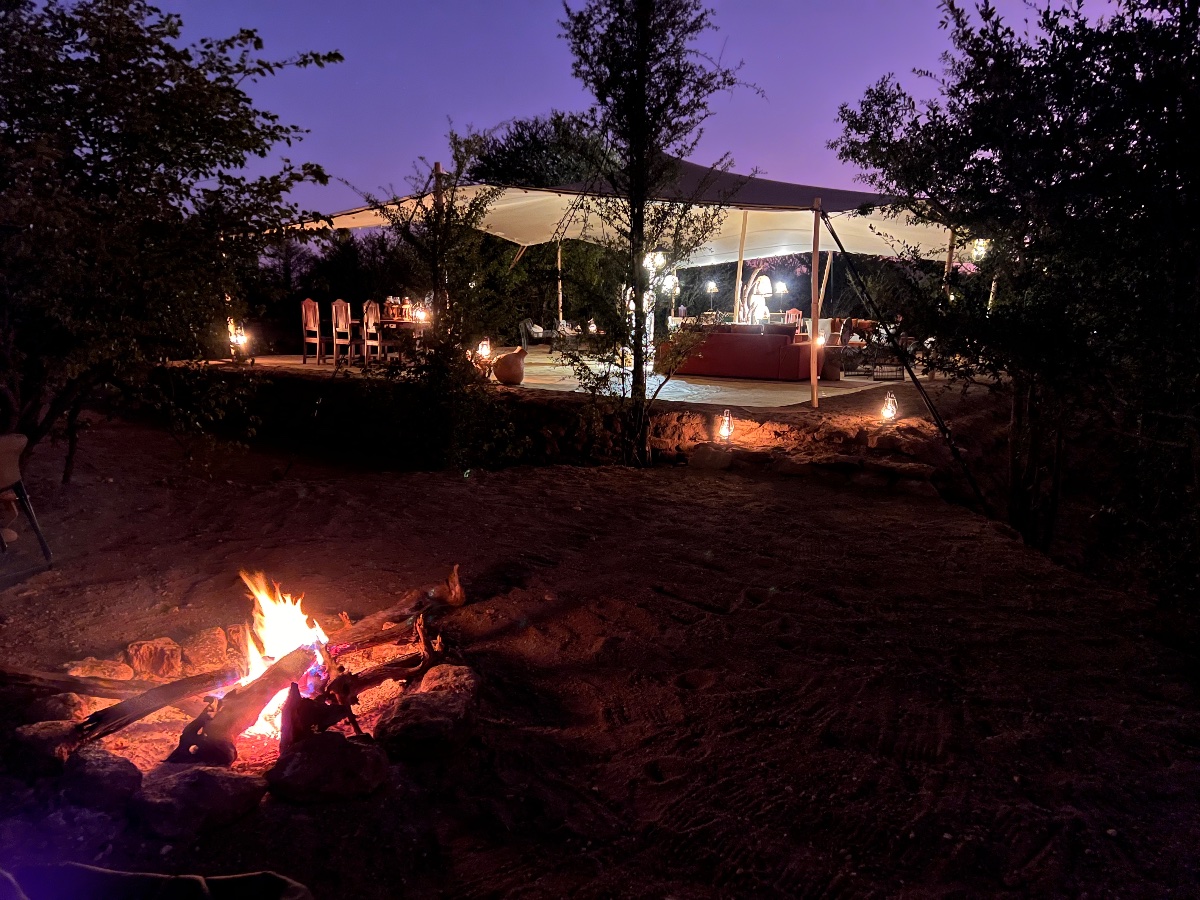 The main entertainment area overlooking the salt pan and spring is a large Bedouin tent, which is open-plan and very much in touch with nature. The floor is still the natural earth, and flows from the seating area, straight in to the bar and dining areas, and then down to the open-air fire-pit with stunning views of the stars.