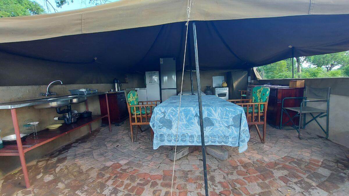 All your crockery and cutlery are provided; there is a solar freezer, fridge, dining table and chairs as well as lighting. A camp hand is available to assist with cleaning, washing up, stoking the boiler and braai pit fires. A favourite spot of the self-catering visitors is the wooden deck located at the front of the main entertainment area which offers a nice view of the waterhole at the front of the camp.