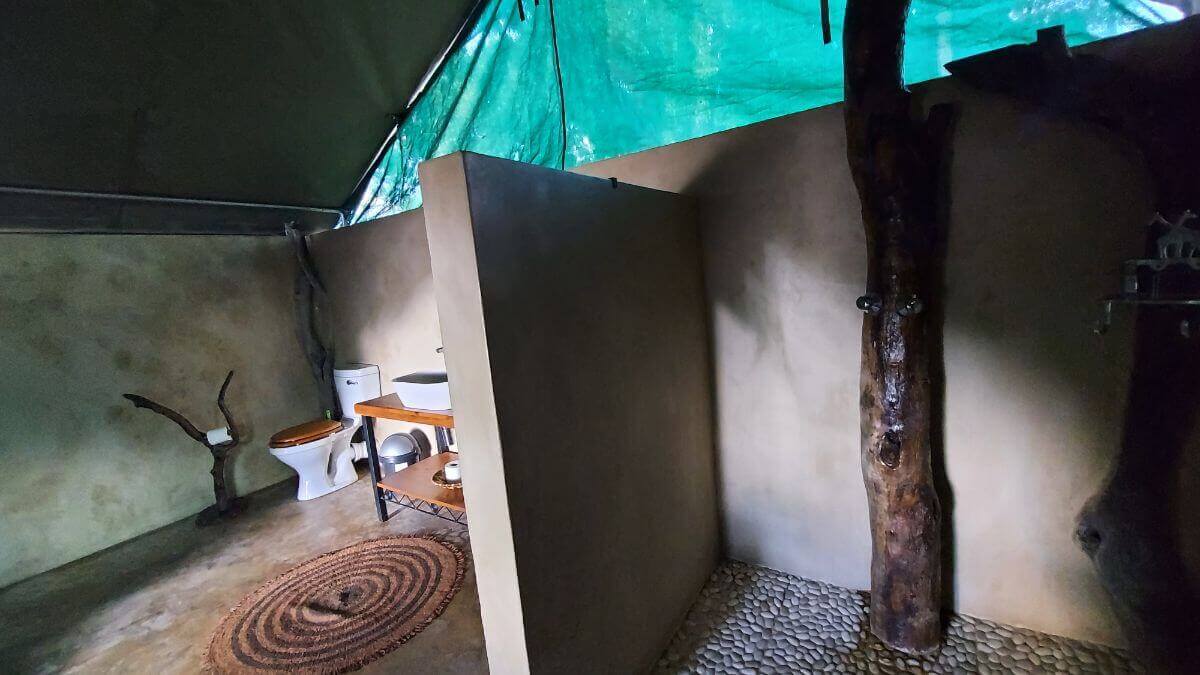 The self-catering section of camp also has 4 en-suite tented rooms but instead of being raised up on decks these are built on concrete slabs at floor level. They also have large en-suite bathrooms with a flush toilet, shower, basin and lots of table space and of course they also have their own verandah with seating and their own individual fire-pits, and charging ports, mosquito nets, and tables. As these are self-catering rooms, they have access to a shared kitchen and all its facilities.