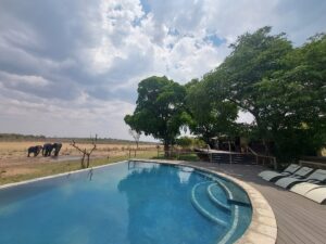 The hotels’ hub is most definitely the entertainment area, which is made up of a large open-plan lounge area, with beautiful wildlife paintings and engraved wooden pillars. A lot of attention has been paid to the décor of this hotel and the more you look around, the more you notice this. To the left of the central area you follow the steps down to the pool area surrounded by manicured lawns and gorgeous palms and a flamboyant tree. The lighting here at night is spectacular. Adjacent to the pool is the bar (which is currently not stocked as guests use the sister lodge down the hill for meals and drinks. Guests are welcome to bring back drinks from Kariba Safari Lodge to chill in their bedroom mini bars).