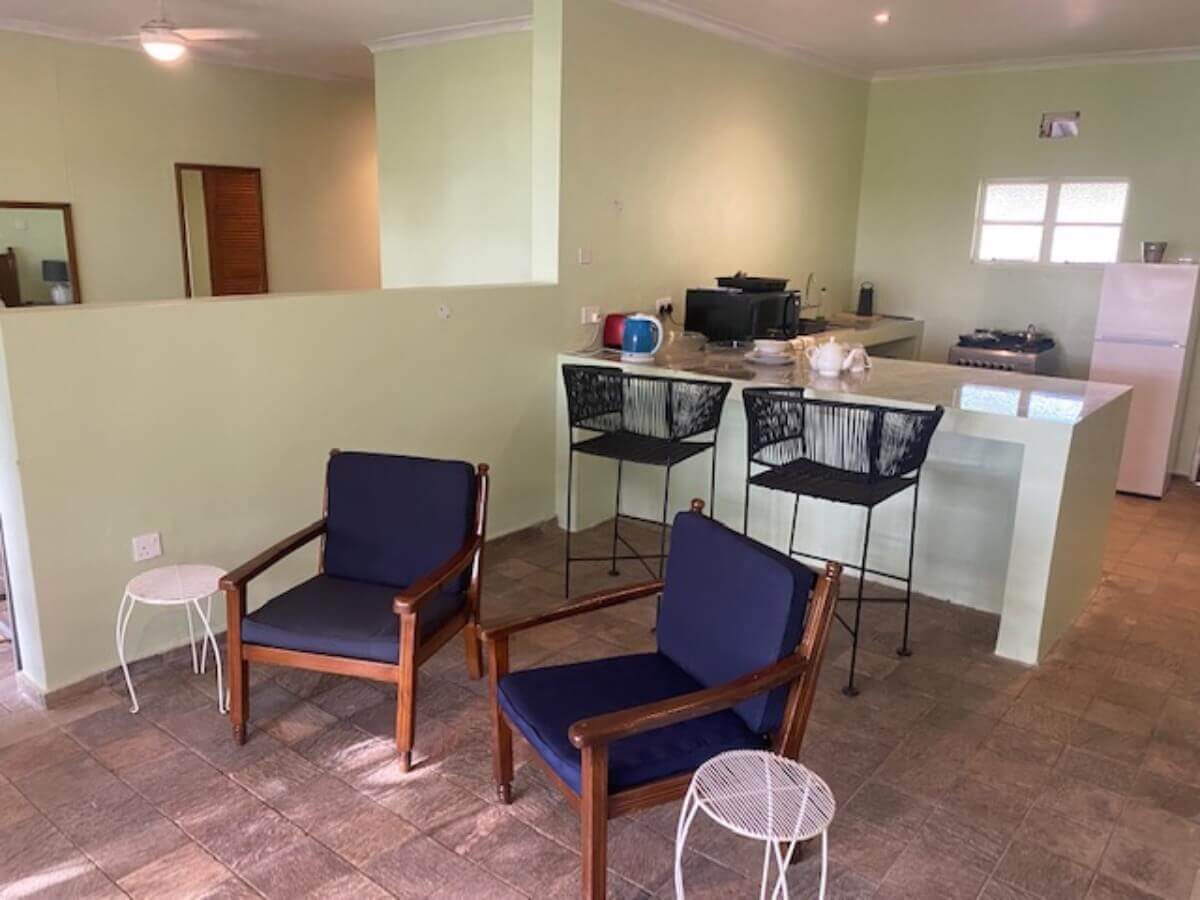 The Wallace Block which consists of 3 flats, that accommodates couples in an open plan self-catering unit. All are en-suite and fully air-conditioned. The large flats have private balconies that look towards the east. The sun rises here are worth waking up for and the small forest of trees gives good shade during the day whilst providing a haven for bird life.