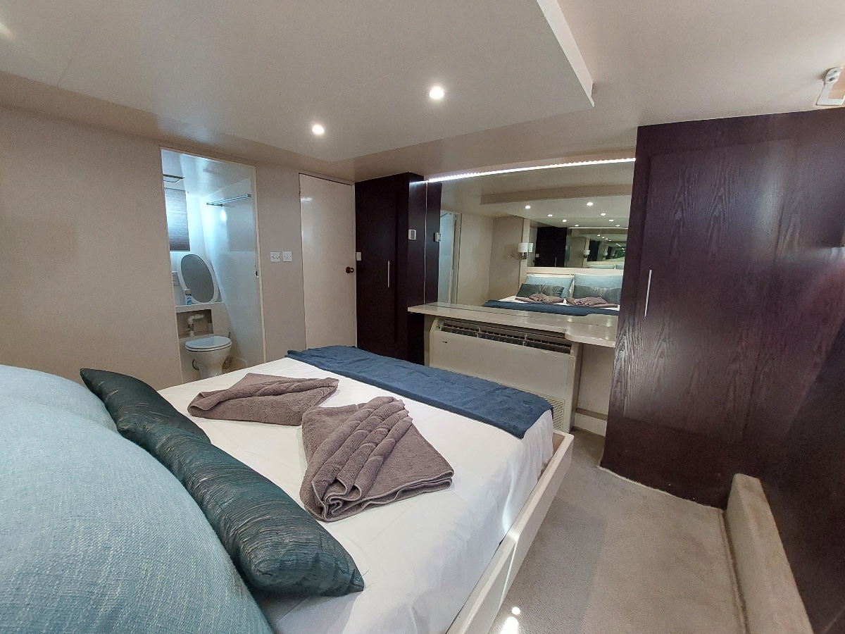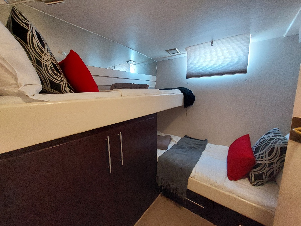 2 queen bed en-suite cabins, 1 cabin with “L” shaped bunk beds, mattresses and mosquito nets provided for guests who wish to sleep on the top deck. There is a 3rd shower room and toilet. The back deck has a covered dining / relaxing area, and there is also a covered top deck with jacuzzi, bar, lounge area. A fully fitted kitchen is located on the bottom deck.