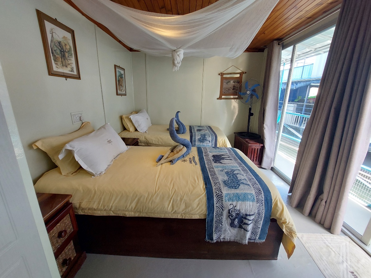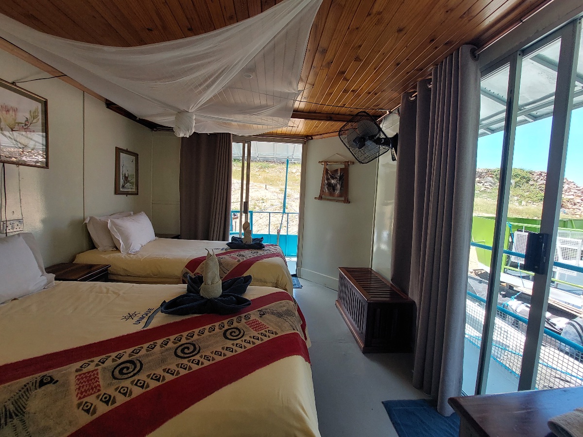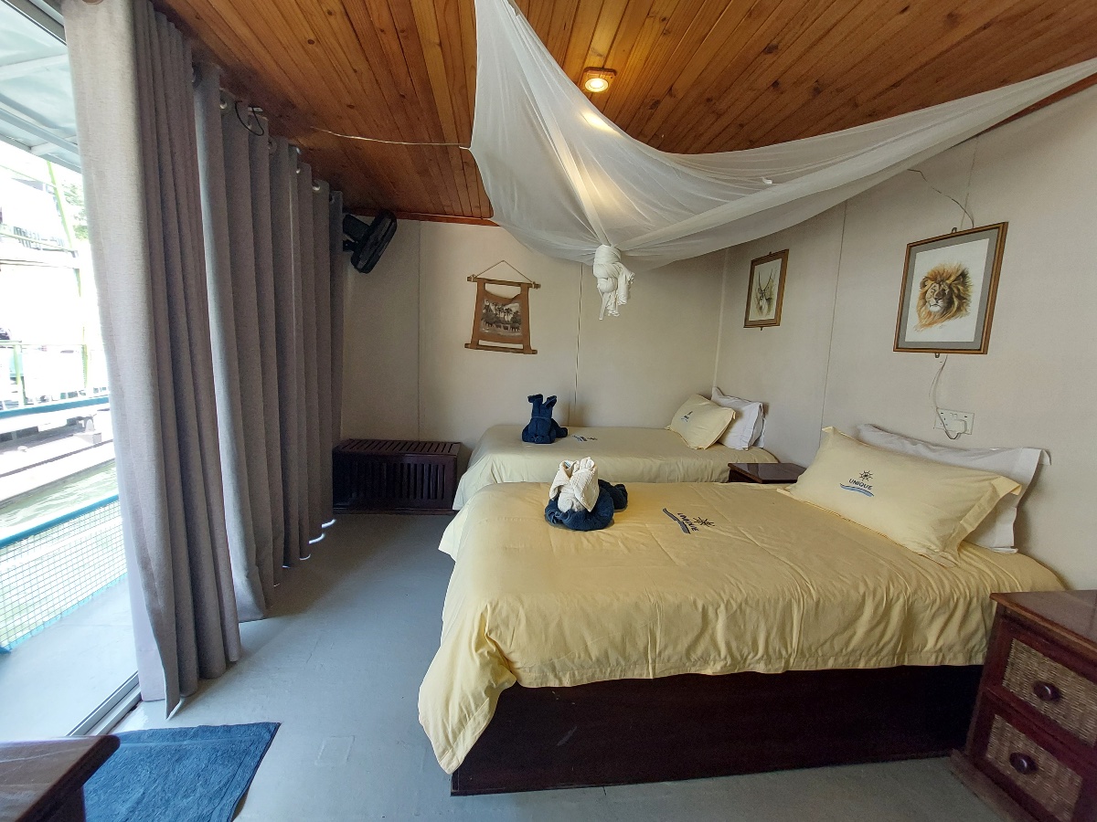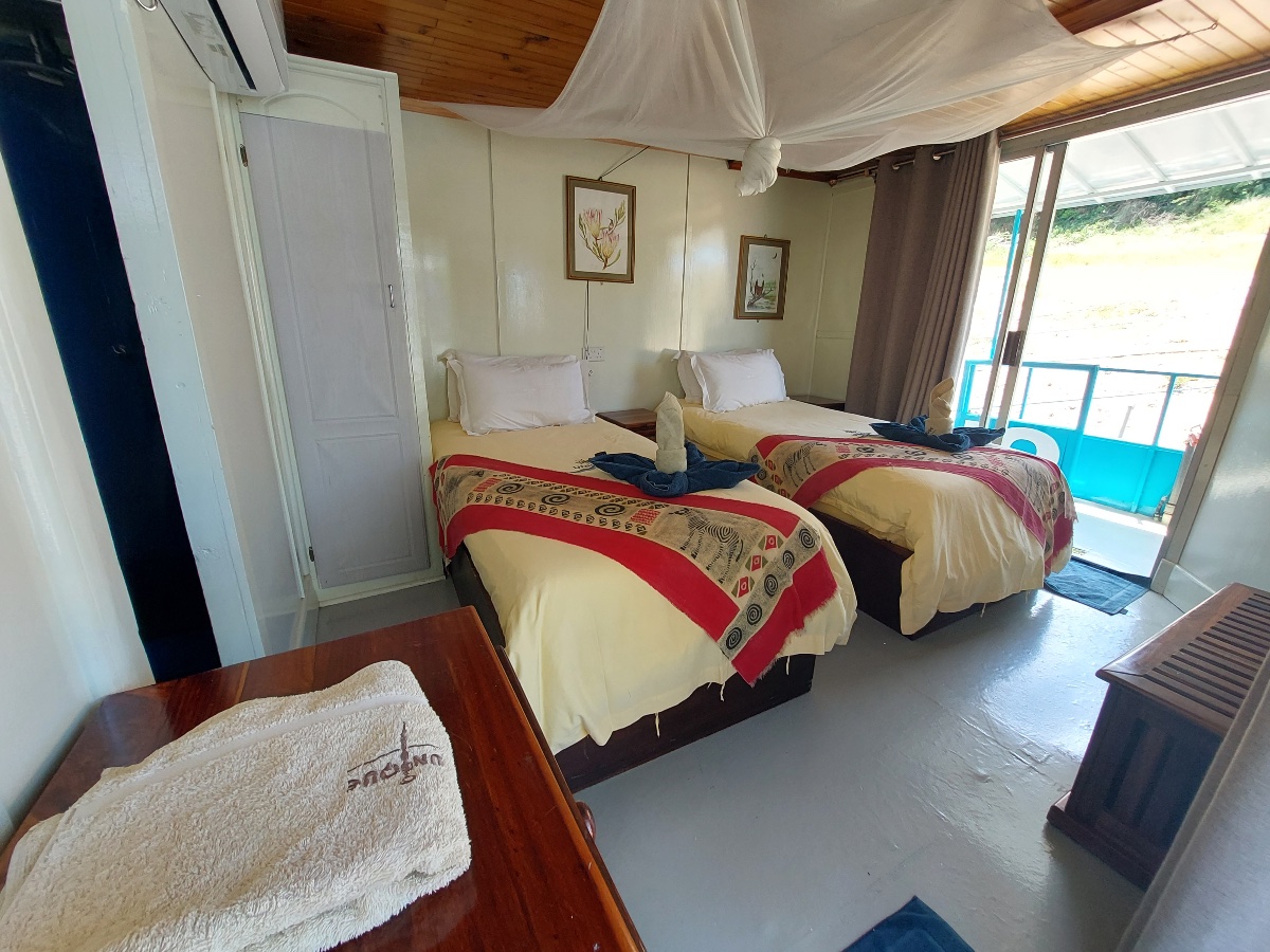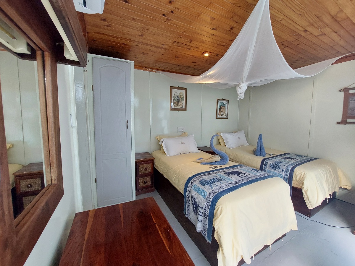 Unique is a beautiful boat nicely finished in Teak. The Lower Deck contains 4 air conditioned en-suite cabins, with a shower, basin and toilet in each. All the cabins can be made up in either a double or twin bed format. The aircon can run all night off the solar. The cabins look out on to the lake with drop down blinds, French doors, mosquito nets and a fan which can run all night. There is a walkway on either side of the boat, providing access to the cabins through sliding doors. All cabins have 13 Amp (square pin) socket outlets for charging. Also located on the lower deck is a spacious kitchen and the crew cabin.