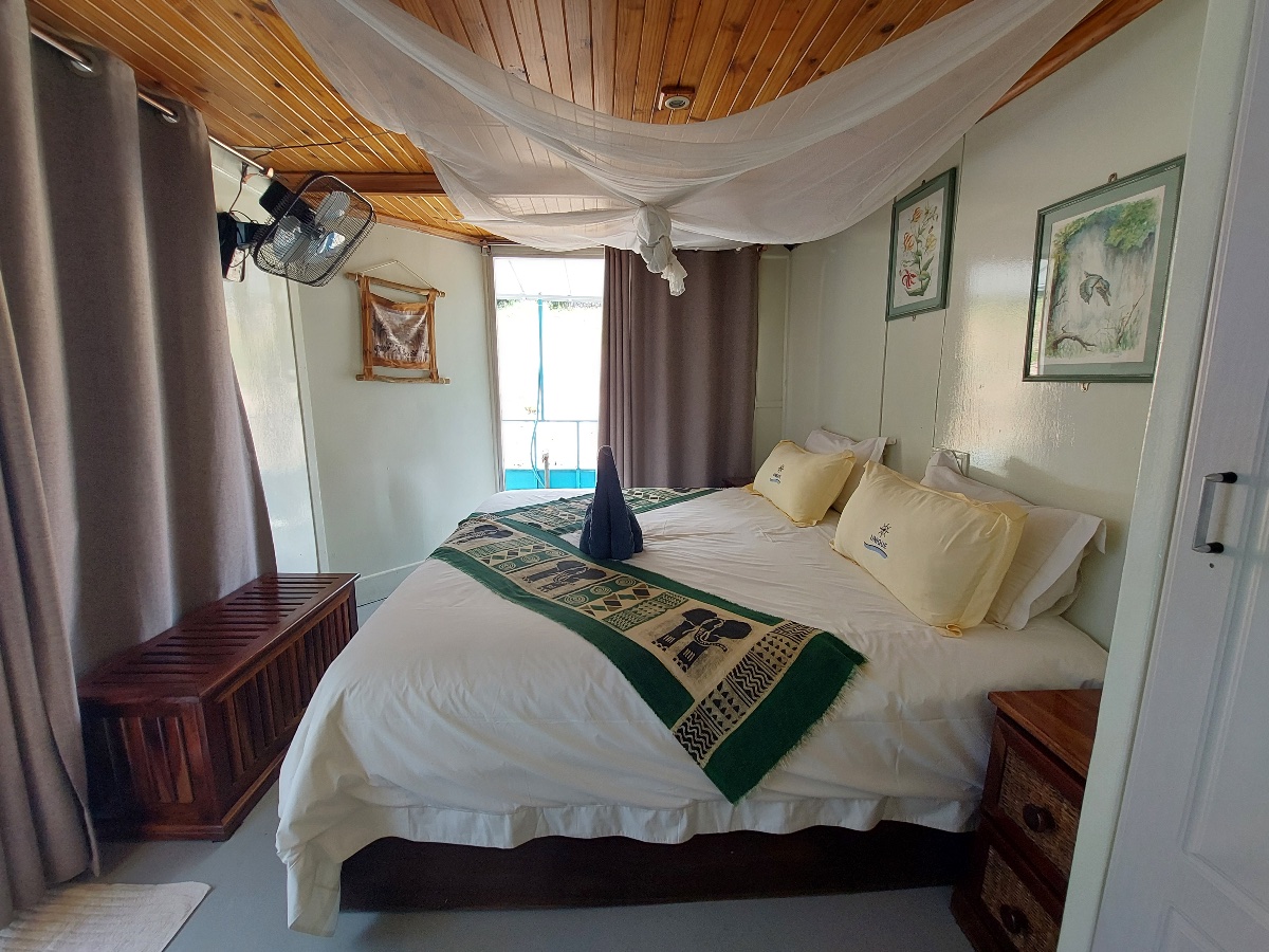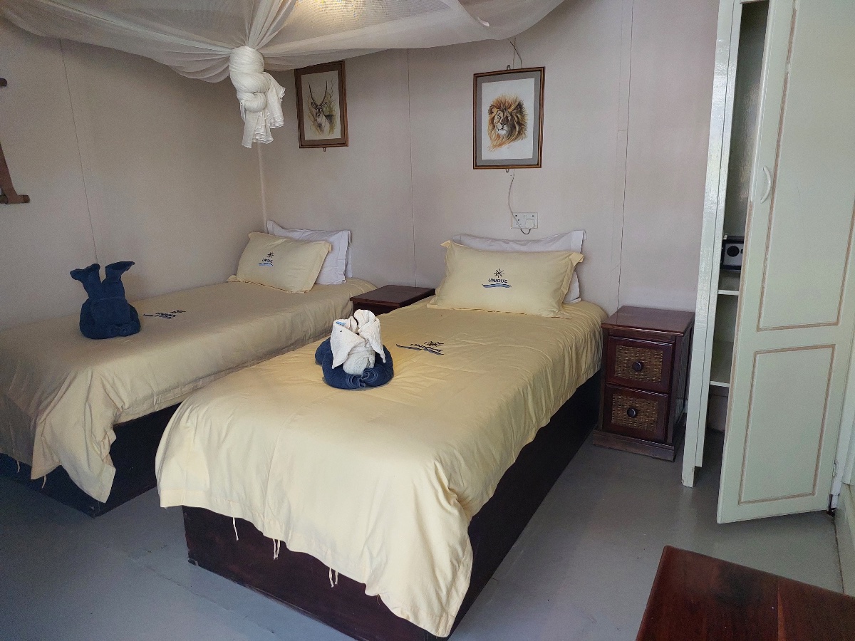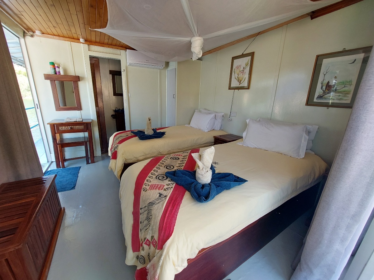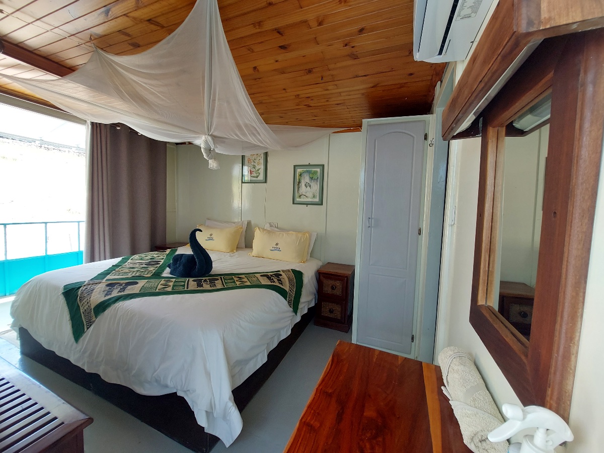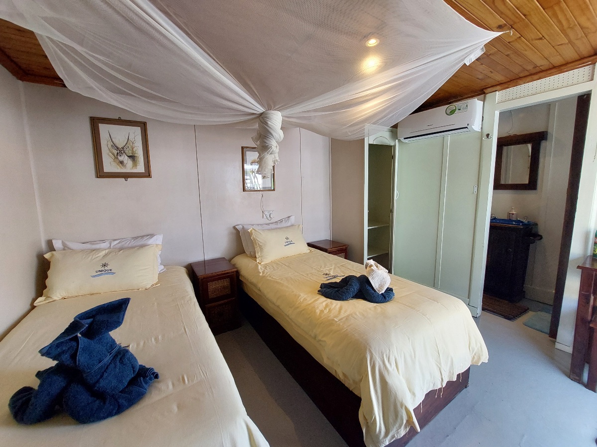 Unique is a beautiful boat nicely finished in Teak. The Lower Deck contains 4 air conditioned en-suite cabins, with a shower, basin and toilet in each. All the cabins can be made up in either a double or twin bed format. The aircon can run all night off the solar. The cabins look out on to the lake with drop down blinds, French doors, mosquito nets and a fan which can run all night. There is a walkway on either side of the boat, providing access to the cabins through sliding doors. All cabins have 13 Amp (square pin) socket outlets for charging. Also located on the lower deck is a spacious kitchen and the crew cabin.