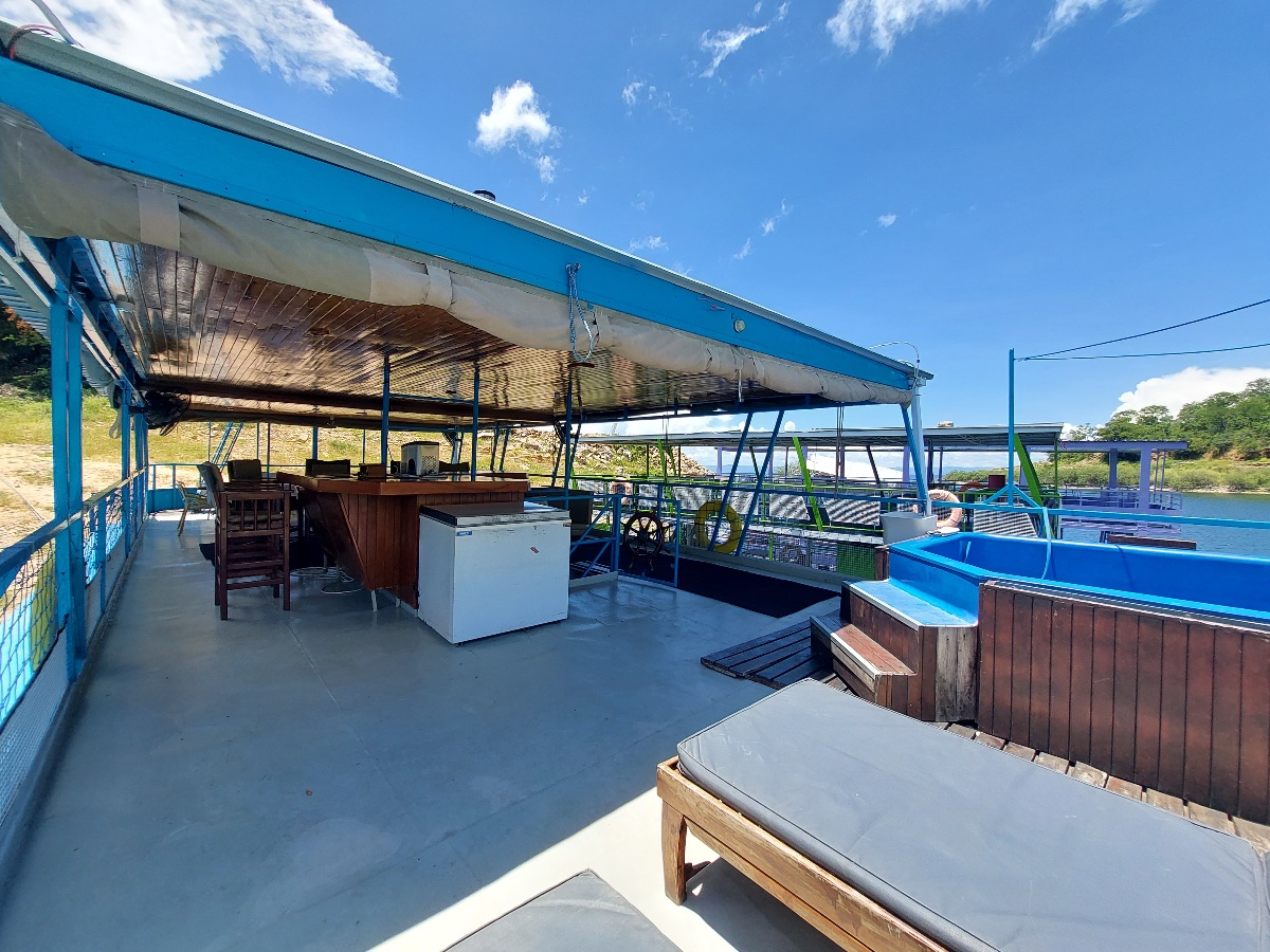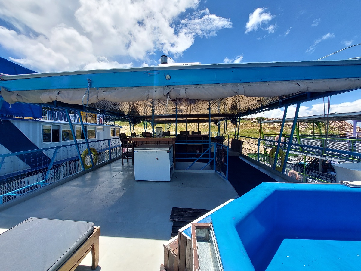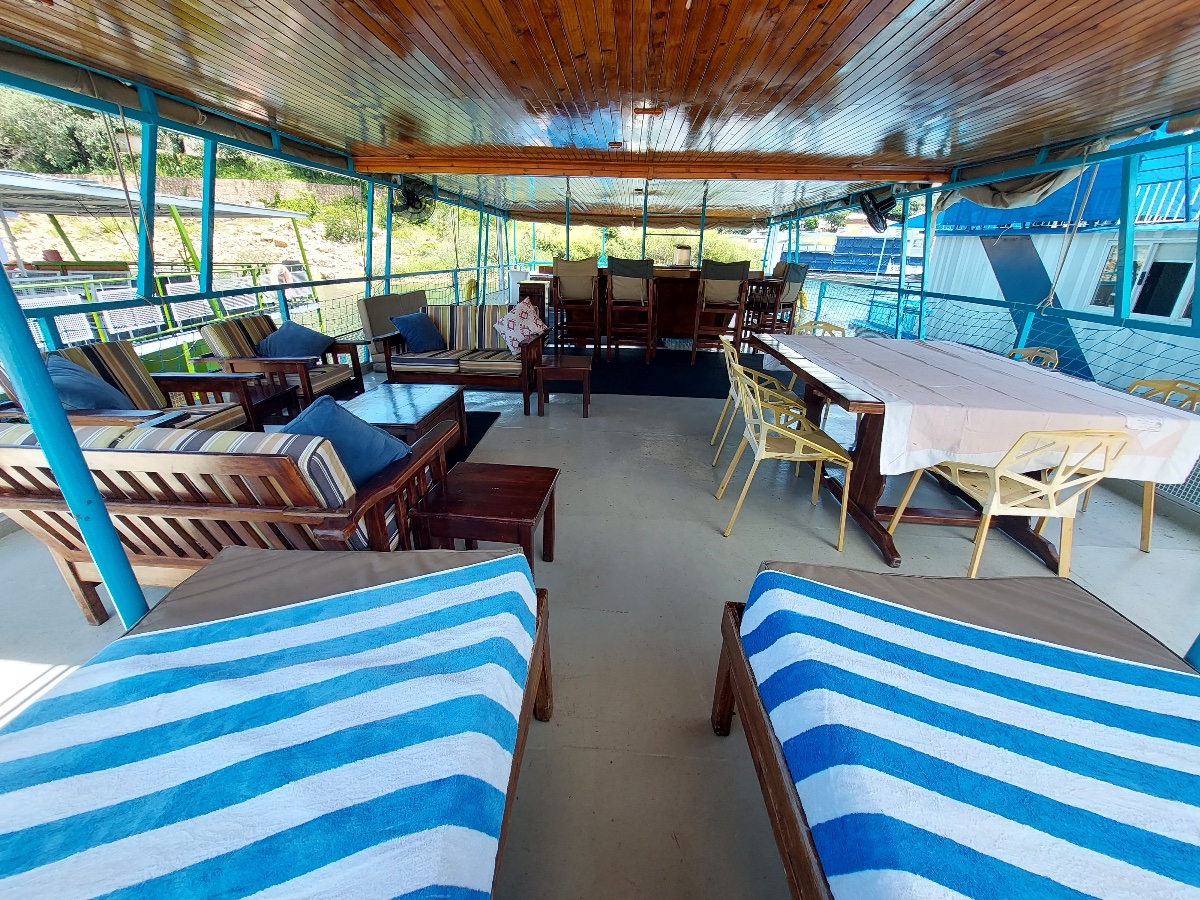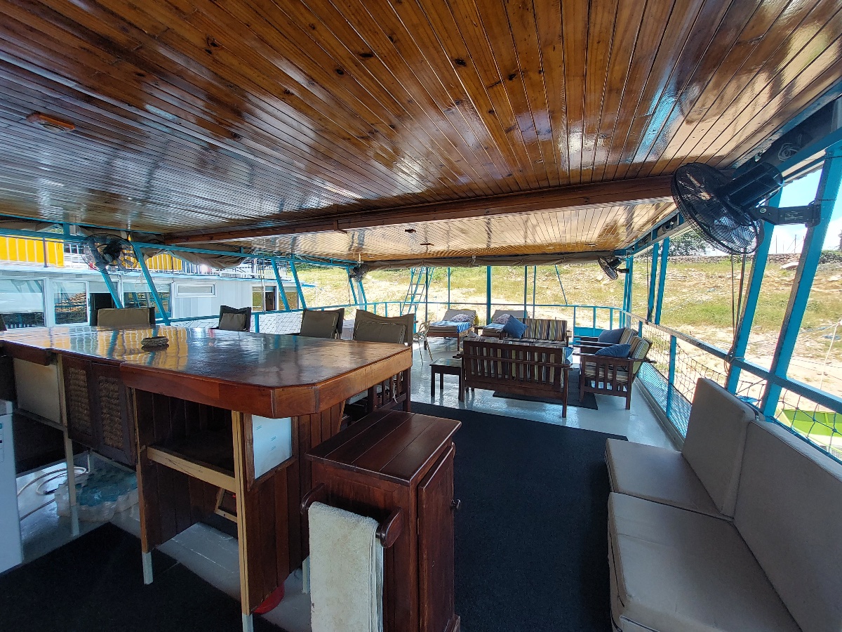 The Upper Deck is accessible via a stairway in the center of the boat, and this is where the main entertainment area is located. There are 4 benches that open out to provide additional beds for those wanting to sleep upstairs (mosquito nets provided.) Dining is done at either the bar or an 8 seater dining room table. The Upper Deck can be all enclosed in canvas awnings, that seal against the weather and also open up to allow fresh air and sunshine in, with 4 fans having recently been added to ensure more airflow. A Jacuzzi and sun loungers are located at the back of the Upper Deck for those wanting to soak up the sunshine.