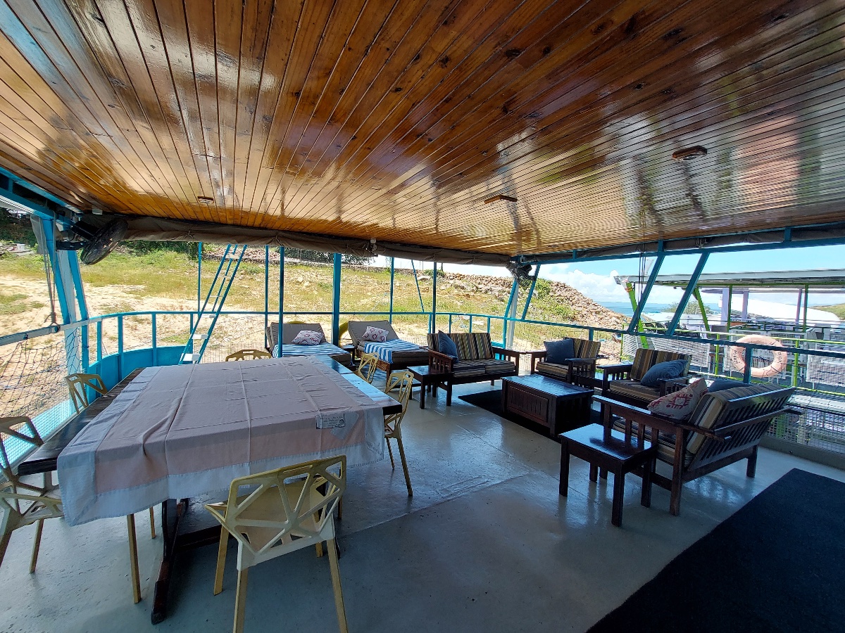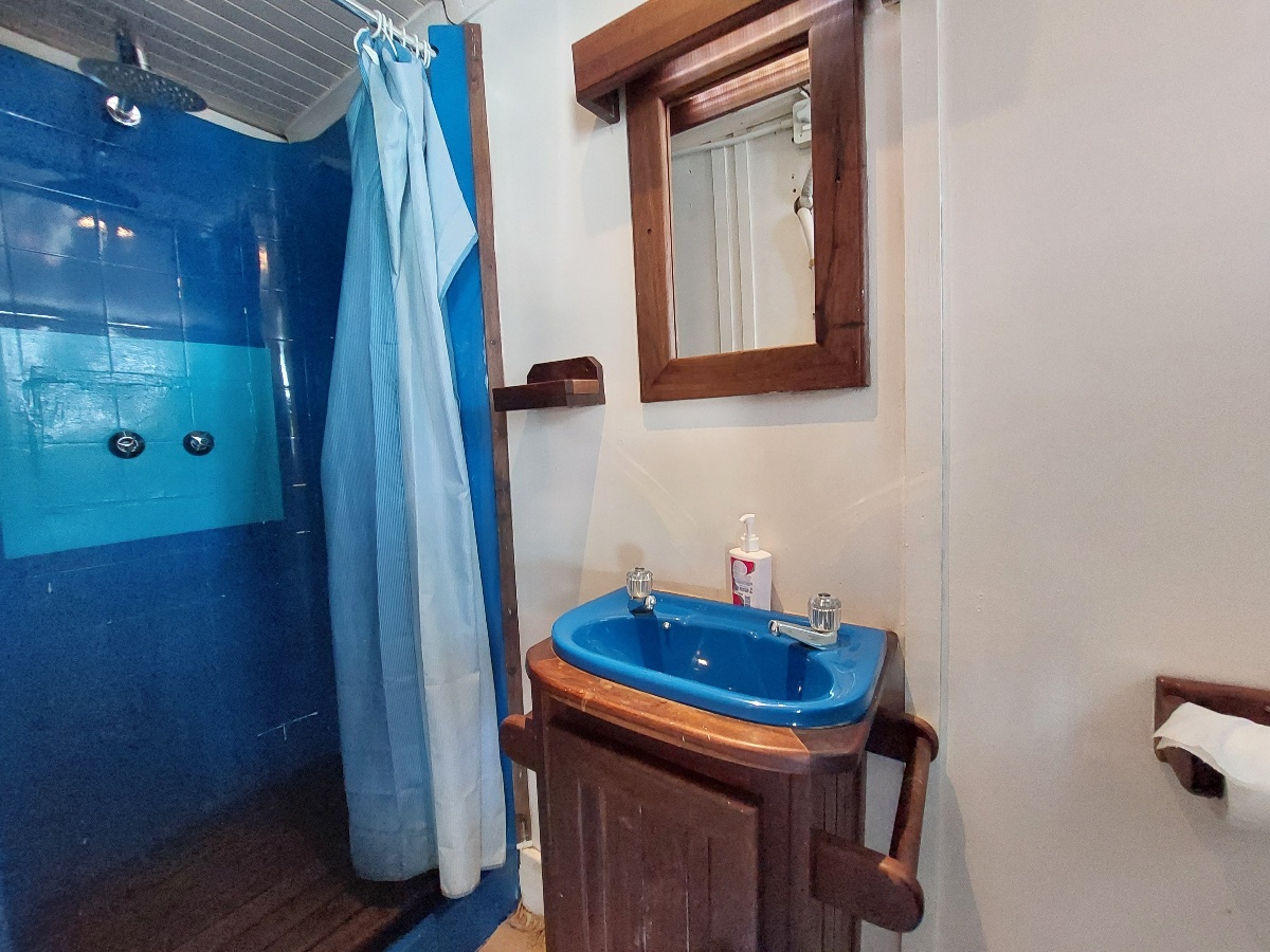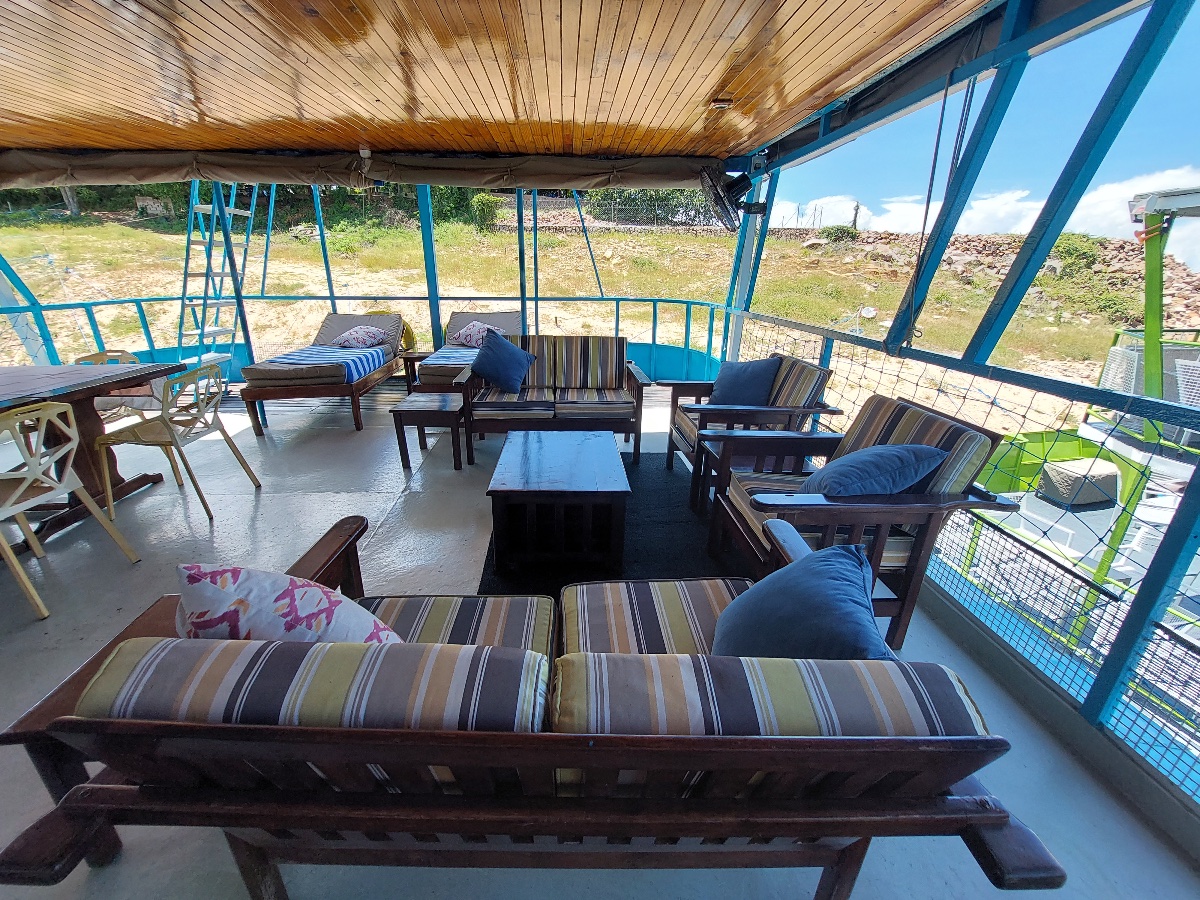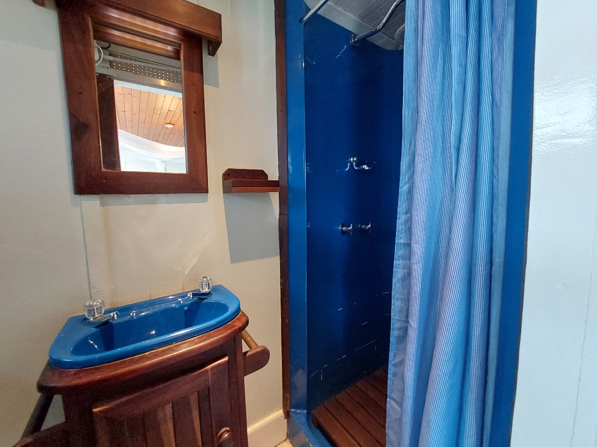 The Upper Deck is accessible via a stairway in the center of the boat, and this is where the main entertainment area is located. There are 4 benches that open out to provide additional beds for those wanting to sleep upstairs (mosquito nets provided.) Dining is done at either the bar or an 8 seater dining room table. The Upper Deck can be all enclosed in canvas awnings, that seal against the weather and also open up to allow fresh air and sunshine in, with 4 fans having recently been added to ensure more airflow. A Jacuzzi and sun loungers are located at the back of the Upper Deck for those wanting to soak up the sunshine.