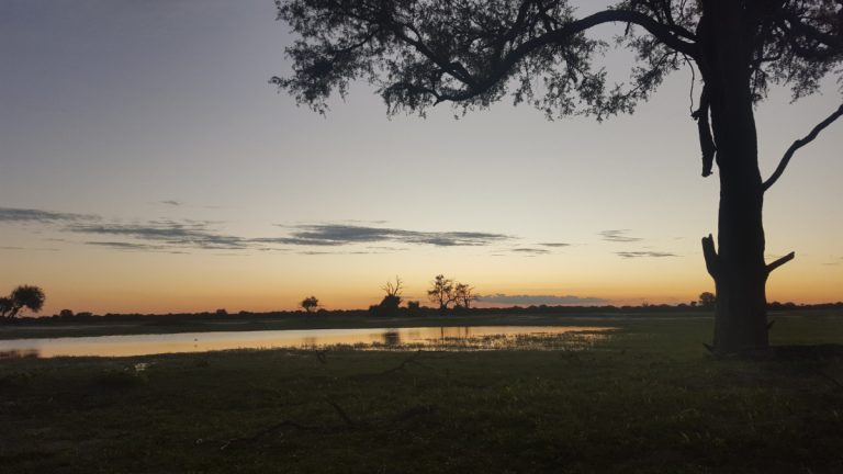 After sunset drinks on the boat, we were driven back to camp in time for the three-course dinner in the Boma area.  Peter kept everyone entertained with all sorts of stories from his many years of being a pro-guide.  Following dinner, we all moved to the firepit for a nightcap, or a coffee.  The guests all got on very well, with lots of joking and laughter.  It was a shame to call it a night, but we needed to, because Peter had to escort all of us back to our rooms due to the fact there are no fences around camp, so all sorts of animals roam freely through camp.  It sure makes you keep your eyes peeled. We got back to our room without a wildlife encounter, but the next morning Peter pointed out the hyena tracks all through camp, and one of the other guests was most unimpressed when he realised his precious travel mug, which he had left behind in error, had been munched to pieces by the hyena!